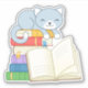 Un pequeño gato lindo está tirado encima de un montón de libros. Se abre un libro frente a la pila.