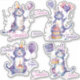 4 ilustraciones acuarelas de gatos morados celebrando un cumpleaños. 🐱
