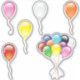 La hoja de 6 pegatinas presenta globos individuales rosados, rojos, amarillos, blancos y naranjas, y un grupo de 10 globos. Esta es una de las dos hojas de globos de 6 pegatinas diferentes en la tienda de LDTreasures.