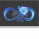 Luminous infinity symbol with glowing, beautiful, lushly blooming rose made of blue flames on black background.