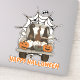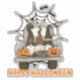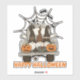 ¡Aquí hay un lindo pegatina para la temporada de Halloween de otoño! Cuenta con tres gnomos blancos con barba sentados en la parte trasera de una camioneta gris. Dos naranjas Jack o'Lanterns se sientan a su lado, con una telaraña, dos arañas y murciélagos en la parte superior. En la parte inferior hay un texto naranja que dice "Feliz Halloween".