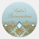 Pegatina de Quinceanera. Damasco de oro y joyas azules. Zazzle exclusivo. Personalizar con sus propios detalles. POR FAVOR, NOTE todas las imágenes planas! ¡¡NO tienen oro, diamantes ni joyas de verdad!!
