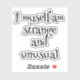 Extraño e inusual Pegatina gótico - Alternativa Cita Decal - Zumo de remolacha inspirado expresa tu lado oscuro y peculiar con este audaz pegatina gótico que presenta la cita favorita del culto: "Yo mismo soy extraño e inusual". Perfecto para portátiles, portátiles, botellas de agua, revistas o incluso envoltura de regalos espeluznante. 💀 Ideal para: Fans de Beetlejuice y Tim Burton estilo Alternativa, gótico o estética brujera Decoración de Halloween o vibrantes y adorables vibraciones todo el año Fabricadas con vinilo duradero, este pegatina es a la intemperie, de larga duración, y hace un gran regalo o acento personal. Añade un poco extraño e inusual a tu vida diaria.