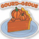 A slice of pumpkin pie is topped with small ornamental gourds, adding a playful touch. The word 'Gourd-geous' is creatively displayed above.