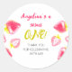 Pegatina Gracias por el primer cumpleaños decorado con un delicado patrón de fresa dulce.