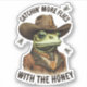 Rana divertida con un gorra vaquero atrapando moscas con miel en este vintage pegatina de estilo occidental para su bebida, viaje, equipaje, libros, llaves-dohickeys electrónicos y más, personalizado con su elección de tipos de letra y texto.