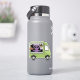 Un extraño morado gracioso en un camión de comida verde con una rebanada de pizza y papas fritas