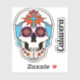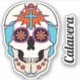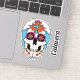 El gráfico de este pegatina contorneado presenta un cráneo de azúcar ilustrado, o calavera, decorado con cuentas y flores, así como una cruz cristiana en cada frente. También hay un pegatina de texto independiente que puede ser personalizado.
