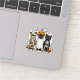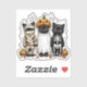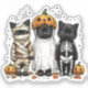 Een charmante illustratie met drie schattige zwarte poezen gekleed in klassieke Halloweenkostuums. Van links naar rechts wordt een schattige kat verpakt als een mummie, een grillige kat draagt een laken om een geest te zijn met een gesneden pompoen op zijn hoofd, en een spookachtige leuke kat is in een skeletoutfit. De scène wordt aangevuld met feestelijke pompoenen en verspreide herfstbladeren, waardoor het ideaal is voor projecten met een herfst- en Halloween-thema.