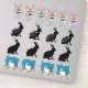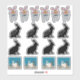 Esta hoja de pegatina de vinilo tiene un grupo de varios pegatinas de conejo de Pascua que incluyen: conejo blanco lindo en una corbata de arco negro que da un pulgar hacia arriba, conejo de silueta negra lisa, conejo de silueta negra con flores blancas y texto de Pascua feliz, y conejo blanco sentado en naranja y flores blancas en un fondo azul.