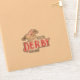Esta pegatina temática de Derby tiene un caballo de carreras de acuarela con un jockey de rosa rodeado de una corona de rosas rojas con el dicho "Háblame de DERBY". Hay un fondo a rayas en blanco y negro.