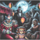 Pegatina de Halloween. El payaso espeluznante, vampiro, zombis y muñeca embrujada cobran vida bajo una luna llena en el carnaval sosteniendo globos negros y naranjas. Arte de ai espeluznante.