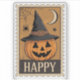 This festive postage stamp features a cheerful jack-o'-lantern donning a classic witch's hat, set against a warm, autumnal background with a crescent moon, star, spider, and web details. Below the playful imagery, the word "HAPPY" is prominently displayed, hinting at a full "Happy Halloween" message. Ideal for sending holiday greetings, party invitations, or for collectors, this stamp adds a fun and spooky touch to any mail or display.