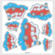 Dibujo de un hombre con traje azul lavando a mano un coche rojo. Conjunto de pegatinas.