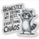 ¡Abraza el caos con este gracioso pegatina de mapache! Con un lindo mapache y la frase relativa "Honestamente, estoy tratando lo mejor que puedo, pero todo es caos", este pegatina es perfecto para cualquiera que sienta que la vida es un poco torbellino. Hecho con vinilo duradero, este pegatina se puede aplicar a laptops, botellas de agua, revistas y más. Añade un toque de humor a tus necesidades básicas cotidianas con este diseño peculiar y relativo.