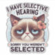 A playful and sarcastic design featuring a Himalayan cat with stunning blue eyes, brown and tan fur, and flowers adorning her ears. With a frown on her face, the cat is paired with bold black text that reads, "I have selective hearing. Sorry you weren't selected." This lively design is available on a range of products, making ideal gifts for cat lovers.