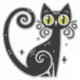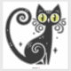 Representación ilustrada de un gato negro adornado con encantadores ojos verdes y giros estilizados que simbolizan la expresión caprichosa y artística, adecuada para temas de fantasía, misterio y diseño contemporáneo.