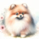 Un perro panomerano esponjoso con un naranja vibrante y un abrigo blanco, con grandes ojos expresivos y una expresión alegre. Está rodeado de flores suaves de color pastel y de suaves salpicaduras de acuarelas que crean un ambiente cálido y acogedor. El fondo es claro y ventilado, realzando el pelaje esponjoso del perro y su comportamiento lúdico.