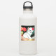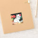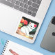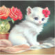 Pegatina con gatito blanco. Mientras el gatito mira fijamente con los ojos azules, las flores rojas adornan sus oídos. Un jarrón de rosas rojas se sienta al lado del gatito blanco. ¡Un regalo maravilloso para los amantes del gato y del arte victoriano!