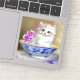Pegatina con un gatito blanco esponjoso. El gatito de ojos azules se sienta en un tazón azul con flores rosas. Una manta morada con flores está cubierta por delante. Un regalo maravilloso para los amantes del gato y del arte victoriano.