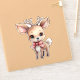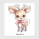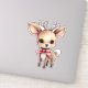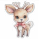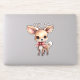 Contacte pegatina con el ilustracion de un adorable venado. Ojos grandes orejas grandes con una cabeza grande y pequeñas cuerdas marrones. Con un gran arco rojo.