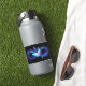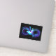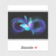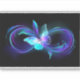 Símbolo infinito con mariposa mágica, morada brillante con alas transparentes, sobre fondo negro. Mariposa brillante.