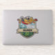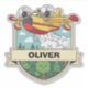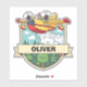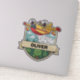 Esta calcomanía personalizada presenta un avión de bomberos amarillo y rojo sonriente que rocía agua sobre un bosque feliz con árboles y nubes alegres.