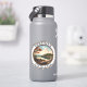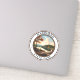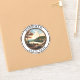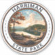 Ilustracion del Parque Estatal Harriman en un círculo de insignias. El parque también es conocido por sus 31 lagos, múltiples arroyos, zona de camping pública y excelentes vistas.