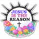 Jesús es la Razón - Pascua, este diseño presenta una corona floral de Pascua con flores y huevos de Pascua y una corona de oraciones así como texto que dice: "Jesús es la razón".