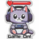 Gatito jugador adorable sosteniendo un controlador de consola con un auricular, con una barra de estado y texto (¡Juego!).