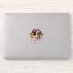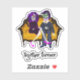 Romántico, divertido y colorido juntos para siempre pegatina de vinilo que representa a un par de Calaveras azucareras con el pelo púrpura moderno sentados en un vintage velour amarillo amor sofá o sofá. Arte original de Suki's, todos los derechos reservados.