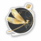 Pintura artística, oro, joyería, libélula espumosa con alas detalladas, filigree sobre flor silvestre dorada, contra círculo texturado negro. Lluvia dorada.