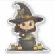 Un lindo gatito se sienta en el gorra de una joven bruja mientras prepara una poción en su caldero. Este pegatina amigable con los niños es genial para celebrar Halloween.