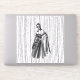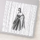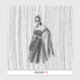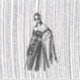 Un ilustracion de diseño en blanco y negro con una mujer encapuchada y un vestido de flores intrincadas con adornos florales y una capa que fluye. El fondo tiene una sorprendente textura vertical de línea, añadiendo un sentido de profundidad y movimiento