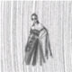 Un ilustracion de diseño en blanco y negro con una mujer encapuchada y un vestido de flores intrincadas con adornos florales y una capa que fluye. El fondo tiene una sorprendente textura vertical de línea, añadiendo un sentido de profundidad y movimiento