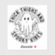 Este divertido y espeluznante diseño de Halloween incluye la frase "Thick Thighs and Spooky Vibes", distribuida en forma circular alrededor de un ilustracion fantasma clásico y bonito. El fantasma, con sus ojos simples pero expresivos, es el foco central del diseño, dándole una vibración lúdica y lúdica. De las manos del fantasma cuelgan dos pequeñas arañas, que le dan un toque de incomodidad al diseño, por lo demás, alegre. El texto es audaz y limpio, lo que crea un fuerte impacto visual y mantiene un tono lúdico. La combinación de colores blanco y negro le da al diseño un aspecto atemporal y versátil, lo que lo hace perfecto para Halloween.
