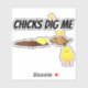 Juego de palabras con el dicho "A las pollitas les gusto", que significa un hombre que se proclama conquistador de damas, pero burlándose del dicho con el uso literal inocente de pollitos escarbando.