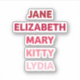Muestra tu lado de la biblioteca y el amor por los libros de Jane Austen con este pegatina de libros que presenta los nombres de las hermanas Bennet en diferentes tonalidades de rosa del Orgullo y el Prejuicio de Jane Austen: Jane, Elizabeth, Mary, Kitty y Lydia. Ideal para los amantes del libro y los fans de Jane Austen. *Tenga en cuenta que la marca de agua Zazzle que aparece en la vista previa del zoom NO aparecerá en el producto impreso final. © Bookish y WonMart