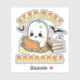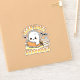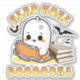 Colorido lindo Halloween "Leer más libros" diseño de texto con un fantasma lindo, gracioso, sonriente leyendo la decoración de un libro