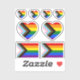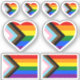Pegatinas: La bandera arcoiris y la variación "Progreso" agrega un chevron a lo largo del hoist que presenta rayas negras, marrones, azul claro, rosas y blancas para llevar a esas comunidades (personas marginadas de color, transexuales, y personas que viven con VIH/SIDA y los que se han perdido) al frente; "la flecha señala a la derecha para mostrar el movimiento hacia adelante, mientras que estar a lo largo del borde izquierdo muestra que aún se necesita avanzar.