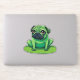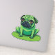 Pug verde lindo que se parece a una rana sentada en un lililipad. Se puede cambiar el color de fondo.