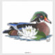 Un pato de madera en el agua con un nenúfar de agua blanca al lado del pato