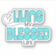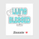 Este inspirador pegatina presenta la cita "vivir mi vida bendecida" en azul acuático con corazón y cruz.