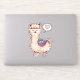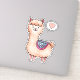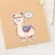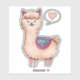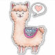 Cuidada pintura acuarela de una llama tan caprichosa con un tejido con motivos multicolores en la espalda. A la derecha hay una burbuja de habla con un lindo corazón rosado dentro.