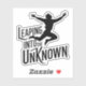 Capturar el coraje de los nuevos y audaces comienzos con este dinámico pegatina que presenta una silueta de un hombre de medio salto, suspendido en movimiento mientras se inmersa sin miedo en lo desconocido. Se muestra la frase "Saltando a lo Desconocido", que simboliza la valentía, la aventura y la confianza en el camino por delante. Perfecto para portátiles, botellas de agua, portátiles o en cualquier lugar que necesite un impulso de motivación.