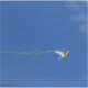 Fotografía de una cometa de pájaro de macao colorida con cintas flotando en el viento que salen de sus alas, volando alto en el cielo azul de verano. Fotografía Copyright ©Kimberly J Tilley.