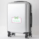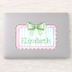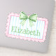 Esta divertida pegatina presenta un marco rosa con rayas azules y blancas y coronado con un lazo de cuadros de gingham verde y blanco. Personaliza con tu elección de nombre o texto especial. Divertido para fiestas personalizadas y bolsas de regalo.