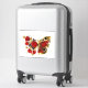 Mariposa de flores de los ojos de pavo real rojo con ala texturada roja, decorada con rosas rojos, pintados artistalmente con tallo dorado y hojas sobre fondo blanco.