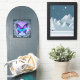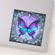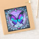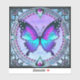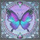 Una mariposa vibrante con tonos azules y violetas se centra en un diseño circular ornamentado, rodeado de intrincados motivos florales y joyas decorativas. La composición general se caracteriza por una estética de vidrio manchado con una mezcla armoniosa de colores y simetría.
