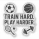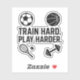 Añade motivación instantánea con este "Tren duro". Juega más duro". pegatina deportivo. Incluye íconos deportivos para fútbol, baloncesto, tenis y gimnasio. Perfecto para portátiles, botellas y bolsas de engranajes.